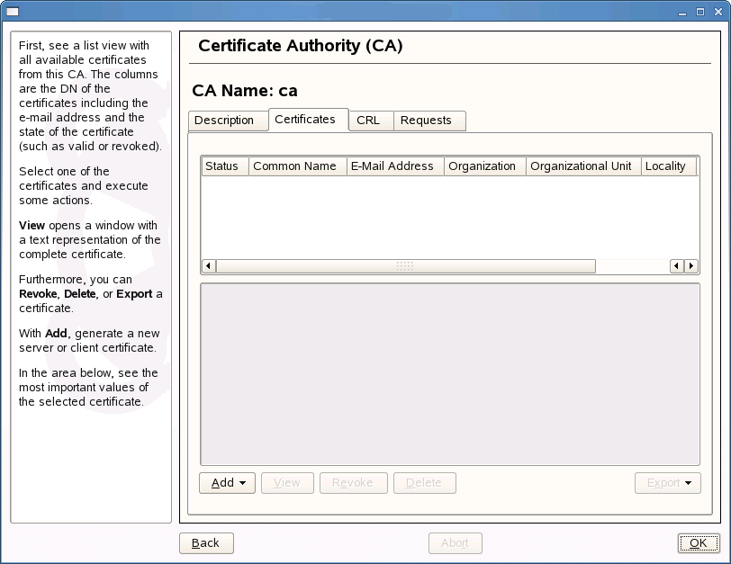 YaST-Based PKI: YaST contains modules for the basic management of X.509 certificates. This mainly involves the creation of CAs and their certificate. YaST provides tools for creating and distributing CAs and certificates, but cannot currently offer the background infrastructure that allow continuous update of certificates and CRLs. To set up a small PKI, you can use the available YaST modules. However, you should use commercial products to set up an official or commercial PKI.