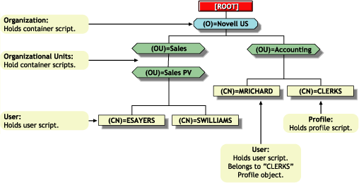 The following figure shows how the different types of login scripts can reside in an eDirectory tree and how they affect users.