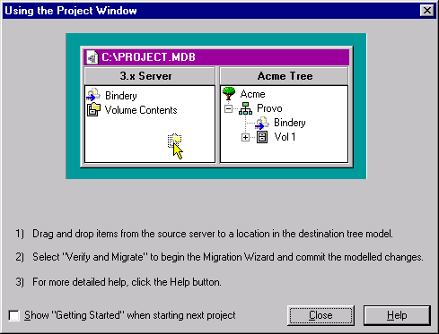 Most of your work will be done in the Project Window, where you can drag and drop NetWare 3 bindery objects and volume data into NDS containers in the destination NDS tree.