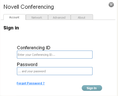 In the Novell Conferencing dialog box, specify your Conferencing ID and password.