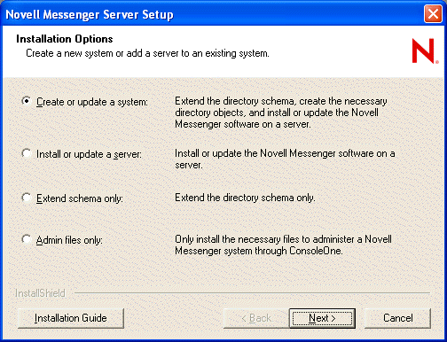 Messenger system administration is performed by using ConsoleOne. The Messenger snap-in to ConsoleOne can be installed with the version of ConsoleOne that runs on Windows workstations and servers, NetWare servers, or Linux workstations and servers. After the initial installation of your Messenger system, you can install the Messenger snap-in to ConsoleOne to additional workstations and servers by using the Admin Files Only option of the Messenger Installation program.
