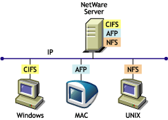 Novell Native File Access Protocols software enables the NetWare server to use the same protocol (referred to as native) as the client workstation to copy, delete, move, save, and open files. Windows workstations perform these tasks using the native Common Internet File System (CIFS) protocol, Macintosh workstations use the native Apple* Filing Protocol (AFP), and UNIX computers use the Network File System (NFS) protocol.