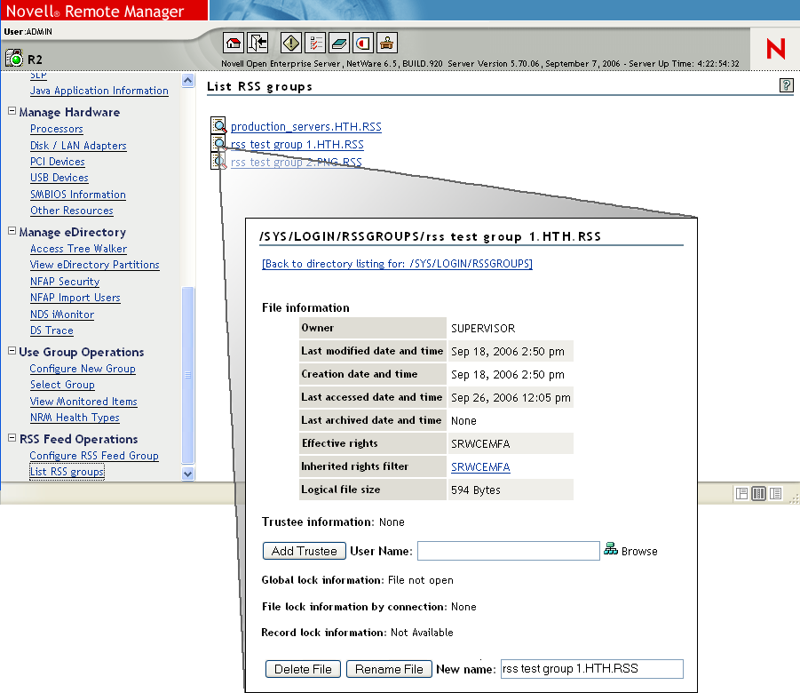 If the button is not available for this file type, add the .rss extensions listed to the sys:login\nrmedit.txt file, and then restart Novell Remote Manager.