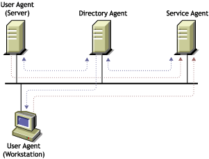 The following figure illustrates how SLP registers a service provider on a local segment. Each agent must register its own services. Whether the User agent is on the server or on a workstation, it can register as a client after it communicates with the Directory agent to see what services are available. Once the service is registered with the Directory agent or Service agent, you can register or deregister the service.