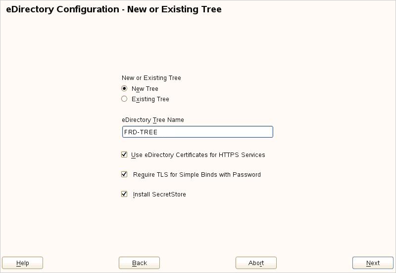 On the eDirectory configuration page, choose whether to install into an existing eDirectory tree or create a new tree.