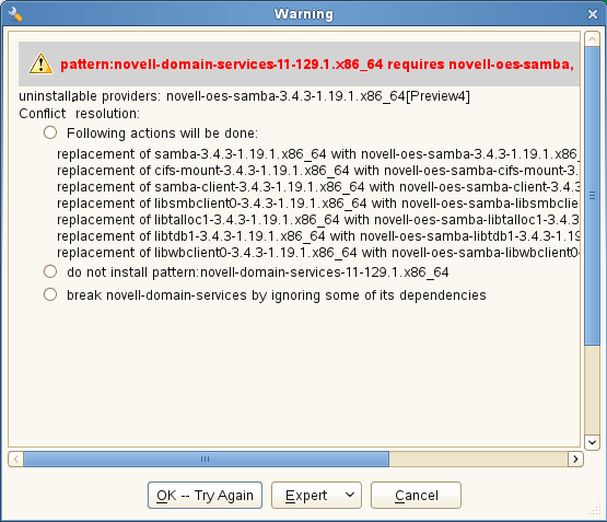 Beginning OES 11, the base samba packages are replaced with novell-oes-samba packages. While installing DSFW pattern, a dialog box is displayed that prompts you to replace base sles samba packages. You must select the option to replace the existing samba rpm's with novell-oes-samba.