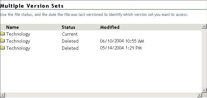 The Multiple Version Sets dialog box lists the multiple instances of versions for the selected file or directory. Only files or directories to which you have rights appear in the list.