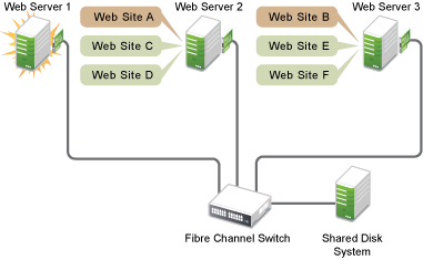 Suppose you have configured a three-server cluster, with a web server installed on each of the three servers in the cluster. Each of the servers in the cluster hosts two websites. All the data, graphics, and web page content for each website is stored on a shared disk system connected to each of the servers in the cluster. Figure 1-1 depicts how this setup might look.