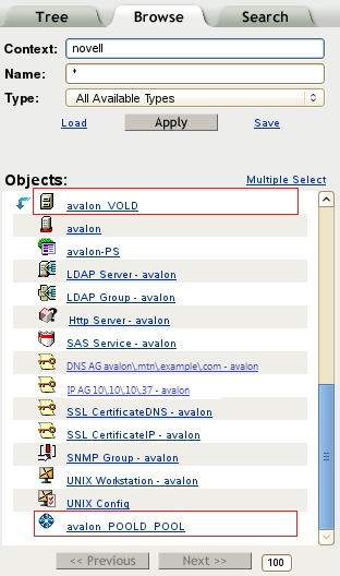 In the Tree View in iManager, browse to verify that the Pool object and Volume object were created.