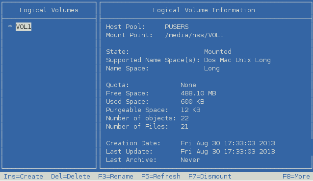On the Volumes page, select the volume, then press F7 Mount.