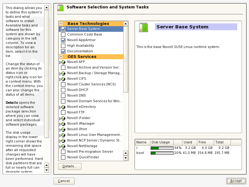 IMPORTANT:To verify that previously installed services are selected for installation and to install any additional OES services during the upgrade, you must customize the Update Options on the Installation Settings page.