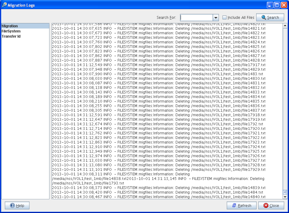 In the main Migration GUI, click View Logs. This displays the Migration Logs window with logs for overall migration and service-specific migration. You can select Migration or a service and use the search functionality to filter logs for a specific type of error messages or keywords. The results are displayed in a new search window. By default, only the last log file is filtered and results are displayed. You must select the Include All Files option to search all log files for a service.