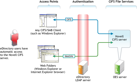 All file service access is controlled by LDAP-based authentication through the eDirectory LDAP server. Although shown separately, eDirectory could be installed on the OES server. |