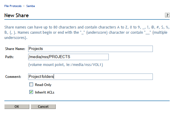 The example shown above creates a Samba share called Projects for the NSS volume named PROJECTS. The share name and volume name do not need to be the same, but making them identical can make share management easier. If you want, you can enter a more complete description of the share in the field.