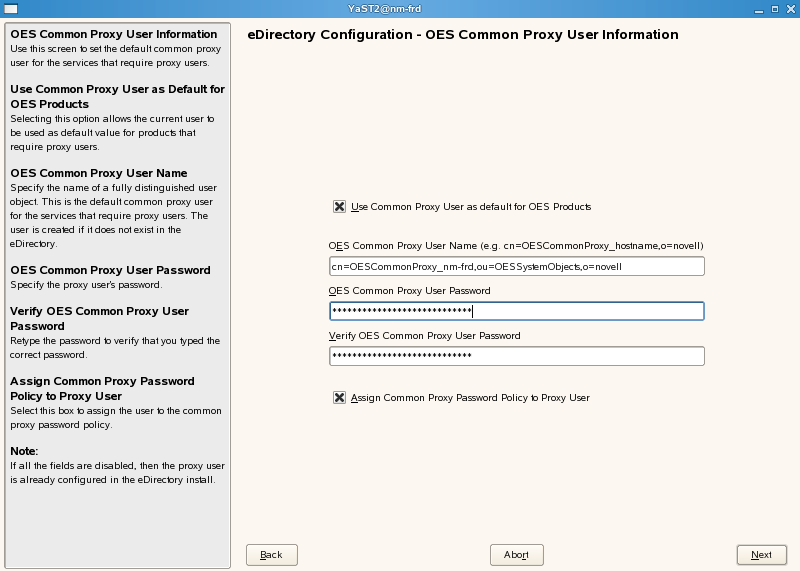 To use common proxy for DSfW, select the check box. When this check box is selected, the OES Common Proxy User Name and Password fields get enabled. These fields are populated with system generated user name and password. However, you can change these values. To change these values see Step 11.b.