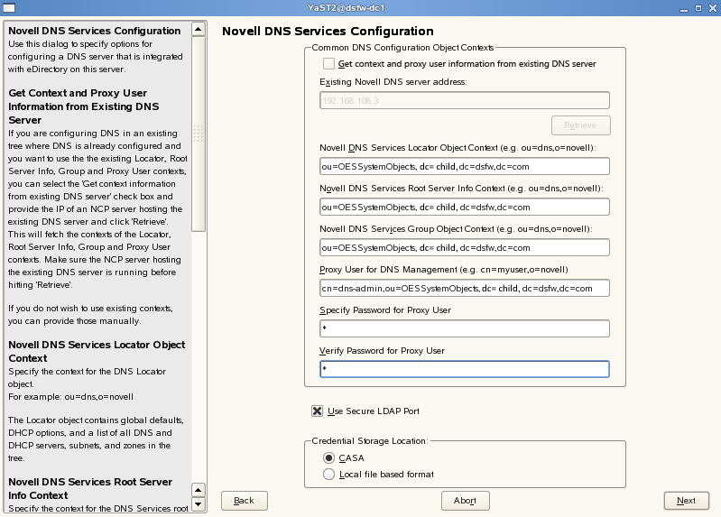 If you are configuring DNS in an existing tree where DNS is already configured, select the check box. Specify the IP address of an NCP server hosting the existing DNS server and click . This will fetch the contexts of the Locator, Root Server Info, Group, and Proxy User contexts. However, the proxy user password is not retrieved. Therefore, you must first retrieve the proxy user password and then specify the password manually in the proxy user password field. To retrieve the proxy user password, run the following command from the existing novell DNS server: