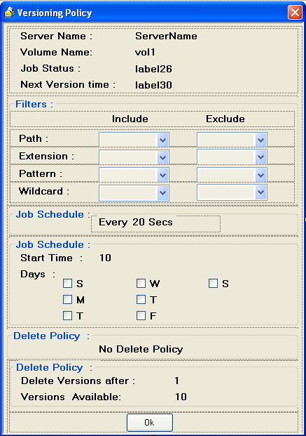 The administrator sets the versioning criteria to filter the type of files to be versioned, duration and the number of versions retained for a given volume. Select the volume to view the policy set for all the files that are eligible for versioning.