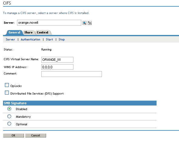 For information on starting iManager and accessing the CIFS server, see Section 5.1.2, Selecting a Server to Manage.