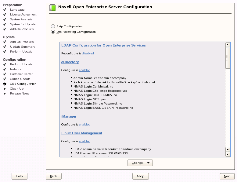 After you complete the LDAP configuration or eDirectory configuration, the summary page is displayed, showing all the OES components you updated and installed and their configuration settings.