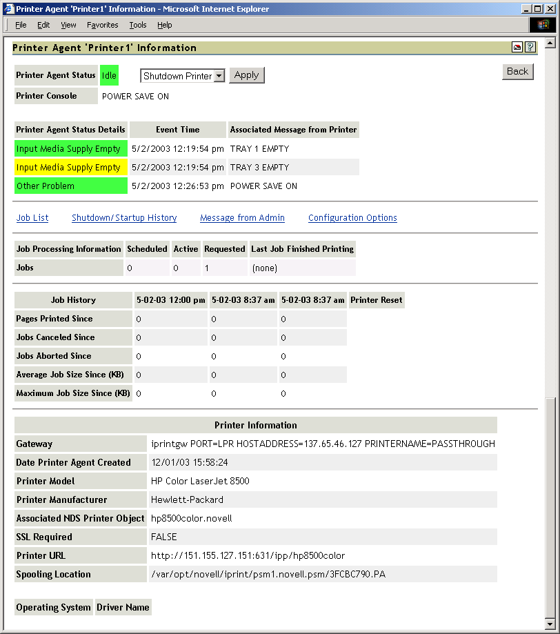 If you select a Printer Agent from the iPrint Manager main page, the following page appears. This section describes the information presented on the Printer Agent Information page.