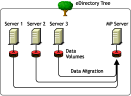 Although Figure 1-1 shows a consolidation scenario in which all servers are in the same eDirectory tree, you can also perform tree-to-tree consolidations.