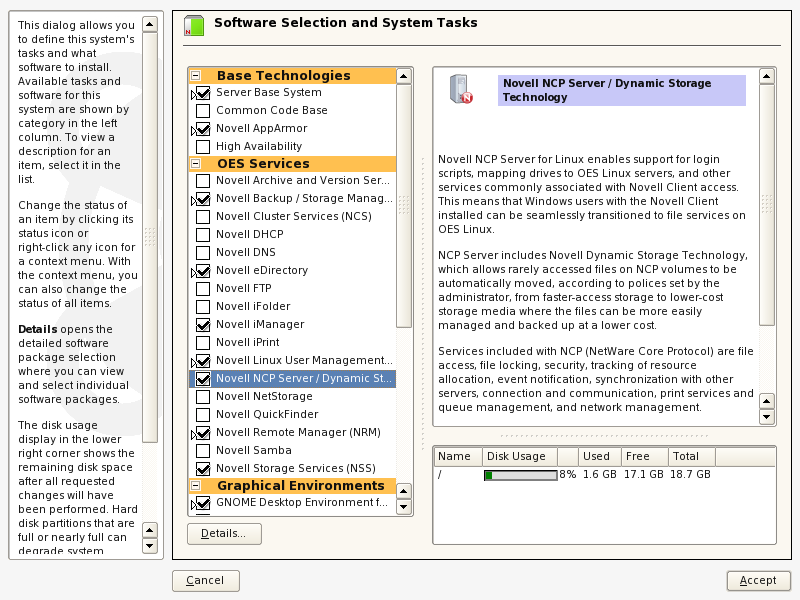 On the Software Selection page under , select and any other compatible OES components that you want to install.