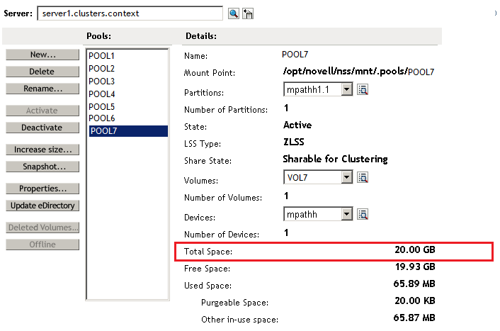 The Total Space for the pool reports only the amount of space that has been allocated to the pool. For example, Pool7 is 20 GB in size.