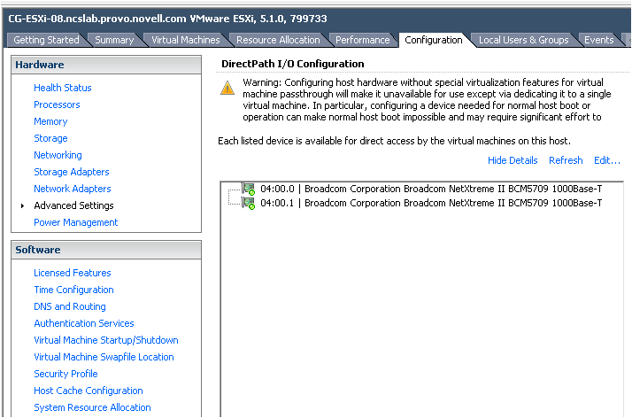 In the Configuration tab, click Advanced Settings. The passthrough Configuration page lists all available pass-through devices, as shown in the picture.