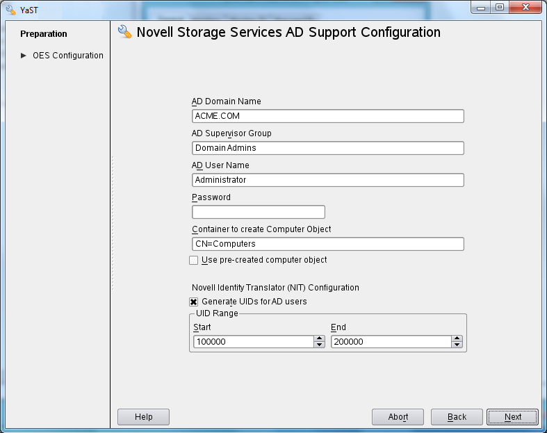 Container to Create Computer Object: You can specify the container under which the OES 2015 SP1 computer object will be created. The default container is cn=computers. If you have already created a OES 2015 SP1 computer object in the AD server, select Use pre-created computer object, then specify the container name where the pre-created OES computer object exists.