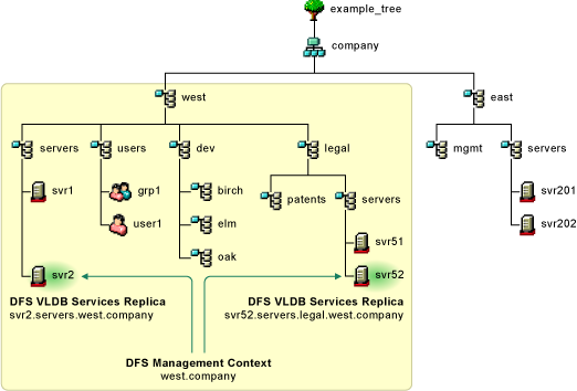 A replica site is the server that hosts an instance of the VLDB service and its VLDB file for a DFS management context. Each management context has one or two replicas. The replicas can be on any combination of operating platforms that support DFS. The servers can be at the same level or below the management context in the eDirectory tree, but they must not be in a lower-level DFS management context.