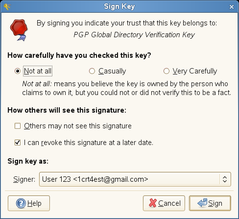 Select how carefully the key has been checked, then indicate if the signature should be local to your keyring, and if your signature can be revoked