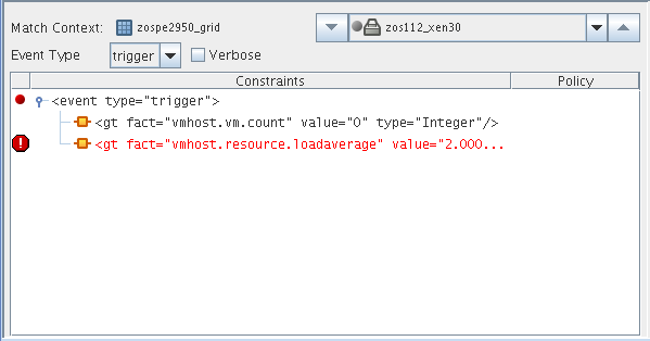 Select one of the Event types in the drop down list to debug how either the <trigger> or <reset> rule(s) are being applied. Constraint types in the list are disabled (dimmed) if they do not apply to the Event that you are debugging.