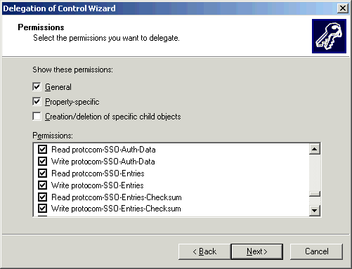 Since these are SecureLogin Help desk level users they will only be granted permissions to manage the SecureLogin attributes. Select the General and Property-Specific checkboxes. Then scroll down and select both the read and write permissions for all protocom- attributes.