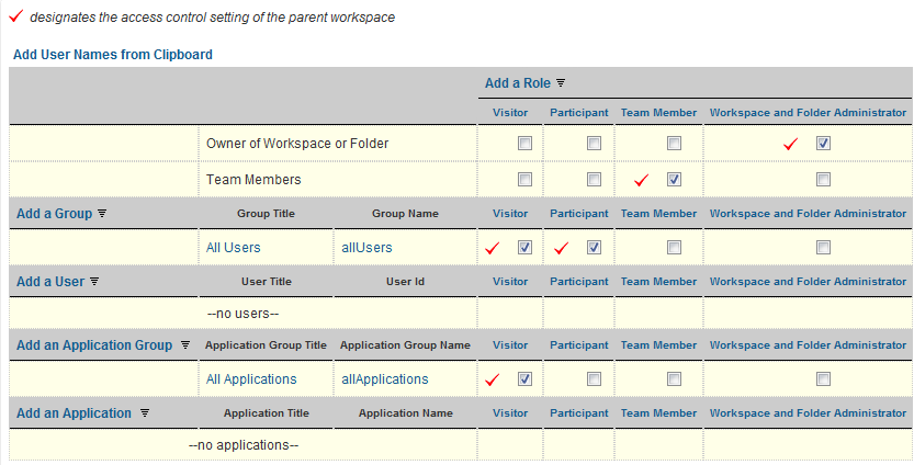 By default, the Global Workspace directory immediately under the Home Workspace inherits the access control settings of the Home Workspace: