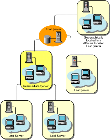 In this configuration, the Leaf Servers roll up data to the next-level Intermediate Server and finally to the Root Server. Another server at a different location is also connected to the Root Server. This scenario is illustrated in the following figure: