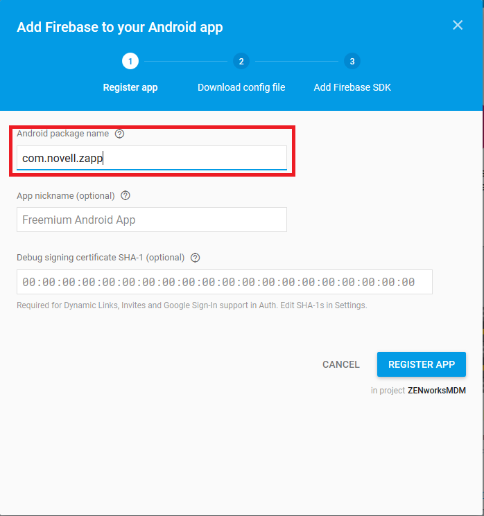 Specify the Android Package Name for the ZENworks Agent App, that is, com.novell.zapp. Click Register App.