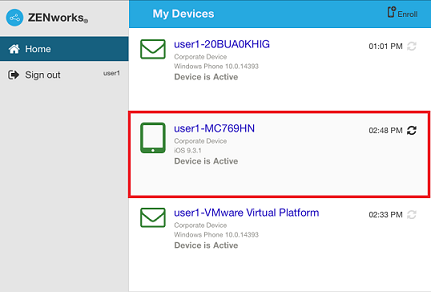 NOTE:If the device remains in Enrollment in Progress state for a considerable amount of time, then in the ZENworks User Portal, tap the refresh icon appearing against the device.