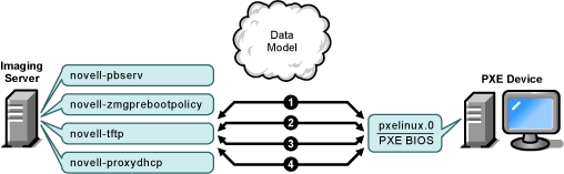 The following illustrations show the interaction between a Preboot Services (PXE) device and a Preboot Services Imaging Server, starting when the PXE device is turned on and begins to boot, and ending when imaging work begins on that device.