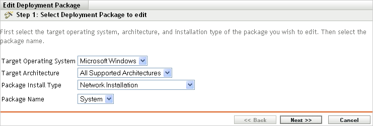 In the Package Name list, select the name of the package that you want to edit. The names in the list are determined by the architecture and installation type you selected. The list displays the names of any packages with the selected architecture and installation type. By default, the system package is always displayed. The system package is the predefined deployment package that meets the architecture and installation type criteria you specified. |