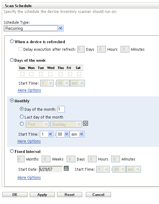 Select whether you want the scan to run when a device is refreshed, on certain days of the week, monthly, or at a fixed interval.