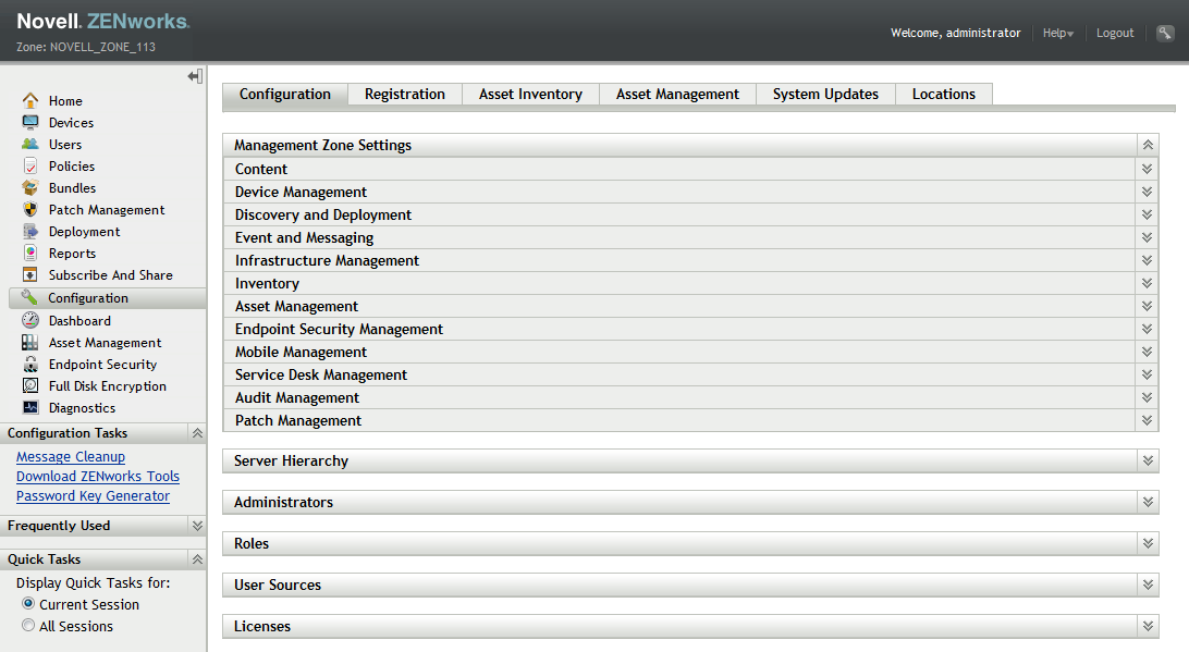 In ZENworks Control Center, click Configuration to display the Configuration page.