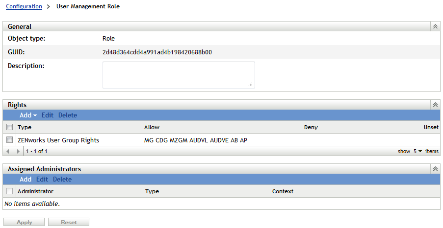 For information about assigning Inventory Report rights, see Section 6.1.4, Assigning Inventory Report Rights to Administrators and Administrator Groups. For information about assigning all other rights, see Section 6.1.2, Assigning Rights to Administrators and Administrator Groups.