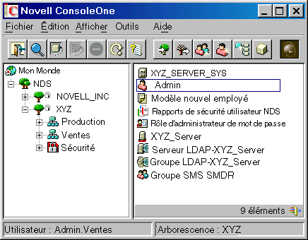 Sous ConsoleOneTM, le réseau et ses ressources sont présentés comme un ensemble d'objets répartis dans différents conteneurs ; Mon monde figure en haut. Utilisez le volet de gauche pour développer et réduire les conteneurs. Utilisez le volet de droite pour travailler avec des ressources spécifiques.