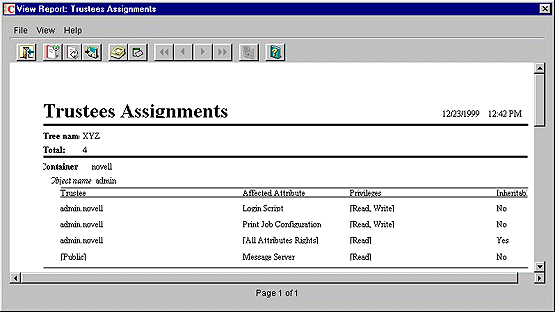 Cette version de ConsoleOneTM inclut des formulaires de rapport prédéfinis qui vous permettent de créer des rapports sur les objets de votre arborescence eDirectoryTM. Voici un exemple de rapport de ce type :