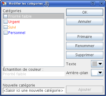 Quatre catégories par défaut (Suivi, Priorité faible, Personnel et Urgent) sont disponibles et peuvent être assignées immédiatement aux éléments. Vous pouvez les modifier et les supprimer si vous le souhaitez, mais vous pouvez aussi continuer à créer d'autres catégories.