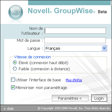 L'interface de base dispose de fonctions et de capacités graphiques limitées. Elle est destinée aux tâches les plus simples de GroupWise. Pour quitter l'interface de base, fermez tous les navigateurs Web et relancez WebAccess en vous assurant d'avoir décoché .