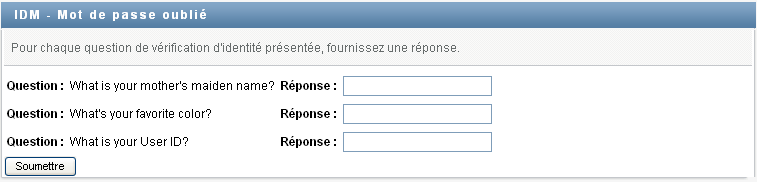 Il se peut que vous soyez invité à fournir des informations supplémentaires dès que vous vous loguez dans l'application utilisateur Identity Manager. Cela dépend entièrement de la manière dont votre administrateur système a défini votre stratégie de mot de passe (le cas échéant). Par exemple :