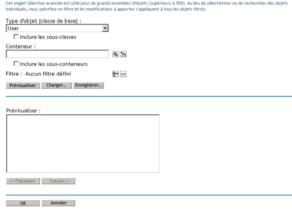 Pour les tâches pouvant s'appliquer à plusieurs objets à la fois (par exemple, Modifier un utilisateur), iManager propose des options, que vous pouvez sélectionner dans le cadre de contenu, pour localiser les objets souhaités.