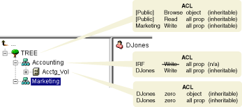 The following process shows how NDS calculates DJones' effective rights to Acctg_Vol: This assumes that DJones doesn't belong to any groups or roles and has not been explicitly assigned any security equivalences. The assignment of zero all property rights at Acctg_Vol overrides the assignment of Write all properties at Accounting.