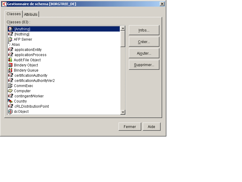 Every object has a schema class that has been defined for that type of object, and a class is a group of attributes organized in a meaningful way. Some of these attributes are mandatory and some are optional. A mandatory attribute is one that must be filled in when an object is being created. For example, if a new user is being created using the User class, which has the employee number as a mandatory attribute, then the new User object cannot be created without providing the employee number. An optional attribute is one that can be filled in if desired but can be left without content. For instance, if a new User object is being created using the User class, which has Other Names as an optional attribute, then the new User object can be created with or without data provided for that attribute, depending on whether the new user is known by other names. An exception to the rule is when an optional attribute is used for naming, the attribute then becomes mandatory. Figure 14 is a sample of part of a schema. Your base schema might appear similar. Figure 14